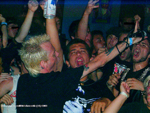 With the next song, ‘Psycho,’ the song revs up with guitar twiddles then breaks into grated guitar. Bones shouting on the top of his lungs, “Fuck You! Fuck Politics!” he makes his way to the middle of the floor [the heart of the pit], taking the microphone with him. Marty is banging out machine-gun guitar as beer is thrown in all directions. At the end of the song, Bones’ impish grin--part teenage-angst, part demon, ignites the crowd with energy, enticing the crowd to shout more with fists up. Well the crowd lived up to the song title, if anything else.